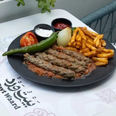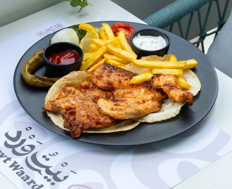 Chickpeas kernels with fried bread, fried meat topped with yogurt and ghee